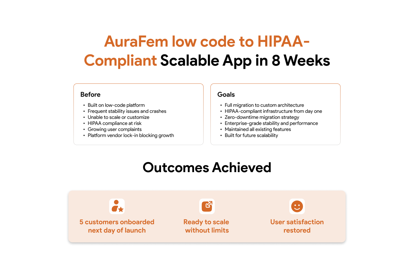 Instead of fighting low-code limitations, the team can onboard practitioners, improve care delivery, and scale with confidence. This transformation didn't just fix issues — it unlocked AuraFem's ability to grow without limits.